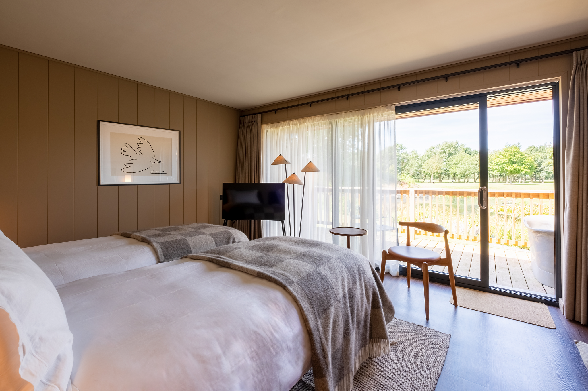 Our one- and two-bedroom lodges are thoughtfully designed in a cosy Scandinavian style, featuring natural materials and sunken outdoor hot tubs. Each lodge includes bedrooms with double or twin beds and en suite bathrooms with spacious showers or bathtubs.